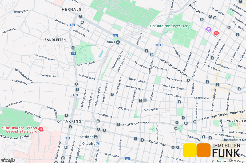 Die Anbindung an das öffentliche Verkehrsnetz ist hervorragend: Die Haltestellen der Straßenbahnlinien 2, 43 und 44 befinden sich nur 39 Gehminuten entfernt. Die Verkehrsdrehscheibe Ottakring (U3, S45 sowie Straßenbahnlinien 44 und 46) erreichen Sie in ca. 16 Gehminuten. Das Wiener Stadtzentrum (Stephansplatz) ist öffentlich in rund 32 Minuten erreichbar.