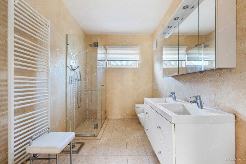 Die Villa überzeugt durch eine durchdachte Raumaufteilung mit separatem Arbeitszimmer, hochwertigen Ausstattungsdetails sowie einem vielseitig nutzbaren Kellergeschoss mit separatem Eingang, Schlafzimmer, Bad, Küche, Pool- und Haustechnik sowie großem Lager- bzw. Hobbyraum. Eine großzügige Garage bietet Platz für bis zu drei Fahrzeuge.