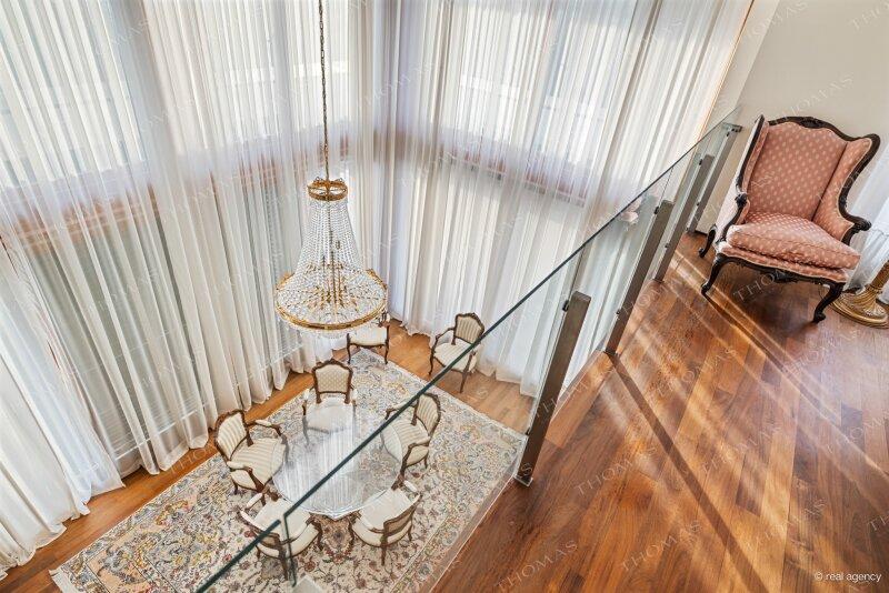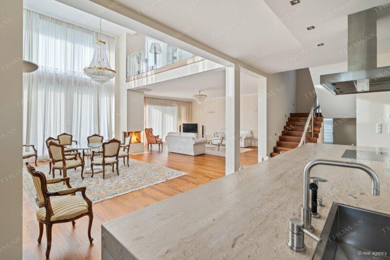 The open-plan living and dining area with a stylish gallery and fireplace forms the heart of the villa. The entire floor-to-ceiling windows can be opened towards the terrace, seamlessly connecting the interior with the spacious garden and the 8 x 4 m swimming pool directly in front of the house a perfect setting for elegant relaxation and privacy amidst nature.