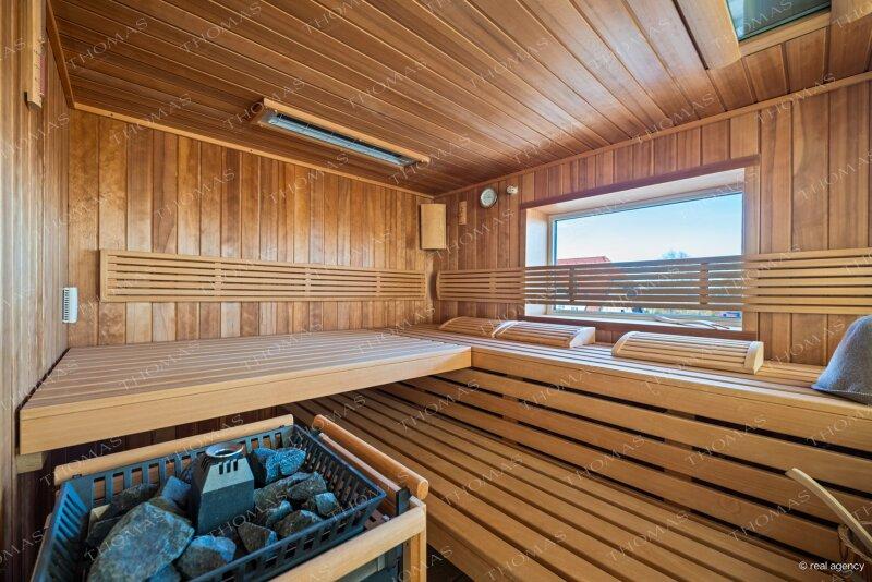 Wellnessbereich mit Sauna, Dampfbad, Whirlpool und Kamin, umgeben von großzügigen Freiflächen mit traumhaftem Panoramablick