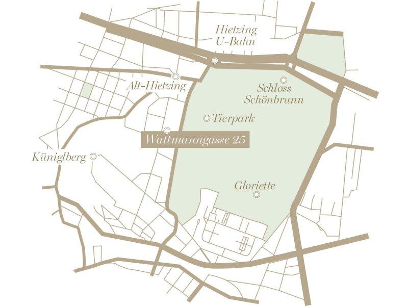 Die noble Wattmanngasse ist geprägt von historischen Bauwerken wie dem 1914 errichteten Schokoladenhaus mit seiner bemerkenswerten Fassadenverkleidung von Ernst Lichtblau und dem ehemaligen Atelier von Egon Schiele, in dem dieser bis zu seinem Tod im Jahr 1918 arbeitete. Der nur wenige Gehminuten entfernte Schlosspark Schönbrunn gilt als idyllischer Ort für Spaziergänge. Der Tiergarten, das Palmenhaus und die Orangerie bieten ein vielfältiges Freizeitangebot. Die Nahversorgung ist ausgezeichnet, mit erstklassigen Restaurants wie Plachutta und Mario Pasta-Grill-Bar in der Nähe, die kulinarische Genüsse bieten.