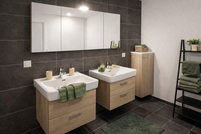 Je nach Objekt werden Kaufpreise mit und ohne Oberflächenpaket angeboten. Das Oberflächenpaket beinhaltet Malerarbeiten, Fliesen-/Plattenarbeiten (z. B. Feinsteinzeug 60 × 60 cm Ares Warm Beige) und Bautischlerarbeiten (z. B. Fertigparkett Eiche Landhausdiele), hochwertige Sanitärausstattung z.B. mit Villeroy und Boch. Für weitere Informationen zur Bau- und Ausstattung kontaktieren Sie uns gerne.