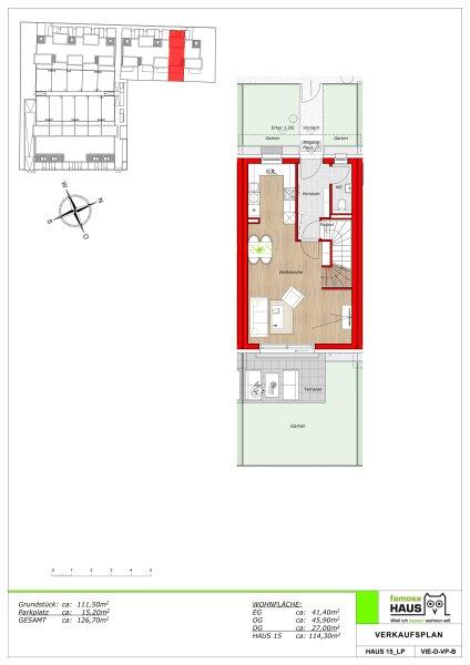 Das Reihenhaus (Top 15) vereint großzügiges Raumangebot mit moderner Effizienz: Auf vier Ebenen stehen vier Zimmer mit rund 161 m² Gesamtnutzfläche (inkl. Keller) zur Verfügung inkl. direktem Zugang zur Tiefgarage. Ein Zuhause, das Rückzug und Offenheit gleichermaßen ermöglicht und dabei klar, hochwertig und funktional geplant ist.