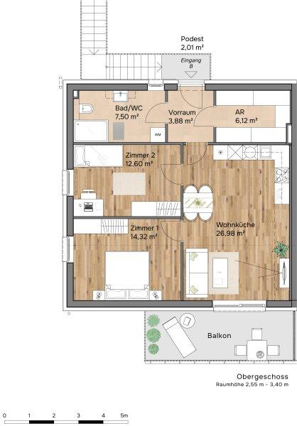 Die dargestellten Schaubilder wurden teilweise digital bearbeitet bzw. mithilfe künstlicher Intelligenz visualisiert. Sie dienen ausschließlich der beispielhaften Darstellung von Einrichtungs- und Gestaltungsmöglichkeiten und stellen keinen verbindlichen Ausführungs- oder Lieferumfang dar. Maßgeblich für die tatsächliche Ausführung sind ausschließlich die vertraglichen Vereinbarungen, Bau- und Ausstattungsbeschreibungen sowie die genehmigten Pläne. Abweichungen in Ausstattung, Materialien, Farben, Möblierung oder Bepflanzung sind möglich.