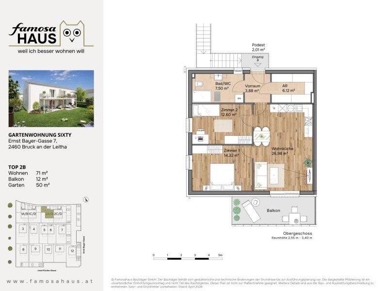 Das Projekt Sixty liegt direkt neben den Famosa-Häusern und Wohnungen in Bruck an der Leitha und richtet sich an alle, die komfortables Wohnen mit Freiraum. Für einen Morgenkaffee am Balkon, für entspannte Abende auf der Terrasse und für ein Zuhause, das sich leicht anfühlt: überschaubar, durchdacht, alltagstauglich. Acht Gartenwohnungen schaffen genau diesen Rahmen kompakt in der Fläche, großzügig im Gefühl.