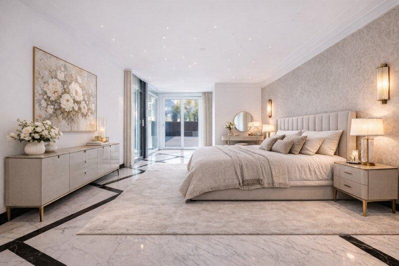 Im Obergeschoss setzt sich das luxuriöse Wohngefühl fort. Zwei helle, großzügige Schlafzimmer bieten ausreichend Platz und verfügen über ein Badezimmer mit exklusivem Marmorfinish, sowie begehbare Kleiderschränke. Der breite Gang verbindet die privaten Räume harmonisch und schafft eine elegante Galerie-Atmosphäre.