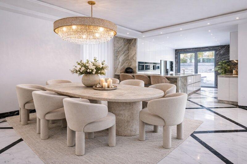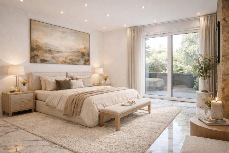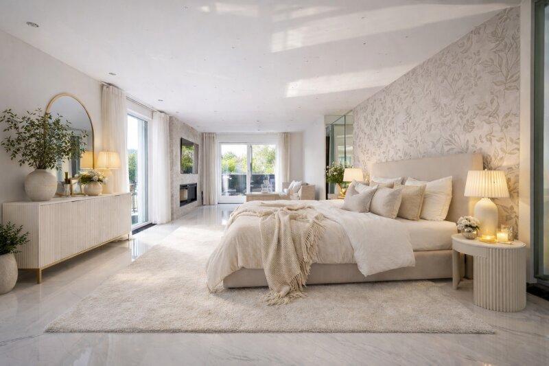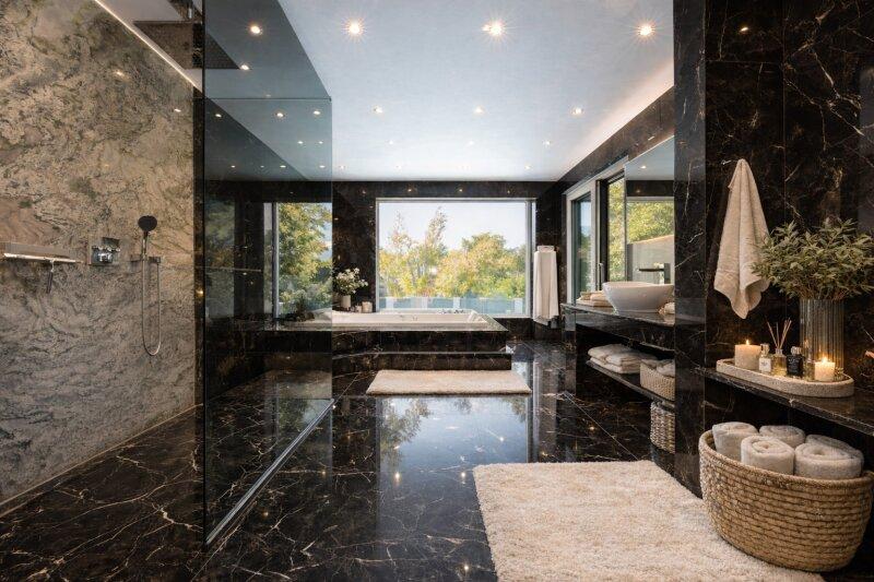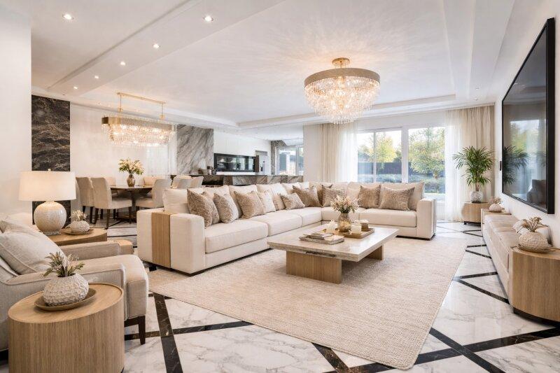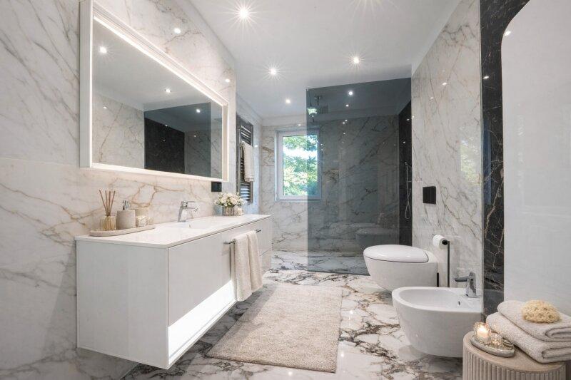Die Ausstattung des Hauses lässt keine Wünsche offen. Naturstein- und Marmorböden schaffen ein harmonisches Gesamtbild. Das durchdachte Beleuchtungskonzept sowie hochwertige Armaturen in den Bädern unterstreichen den modernen Charakter der Villa. Große Glasfronten, helle Räume und eine elegante Linienführung verleihen dem Haus Leichtigkeit und Offenheit.