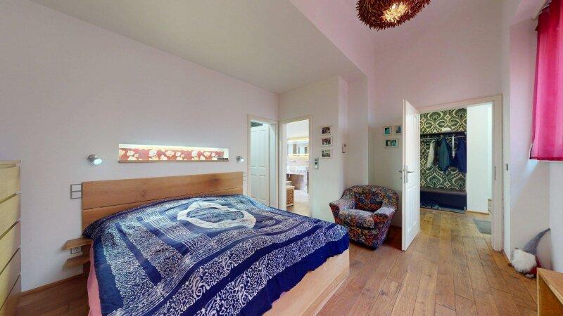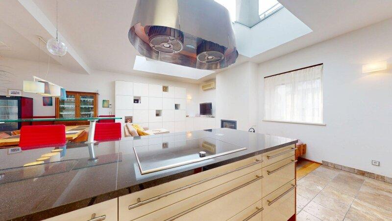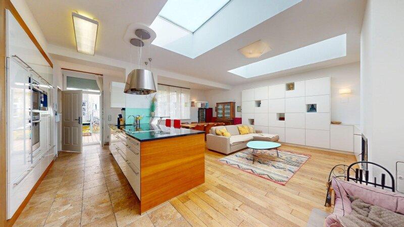 Der offene Wohnbereich mit Einbauküche schafft viel Platz für gemeinsames Familienleben, während die klare Raumaufteilung zugleich Rückzugsmöglichkeiten für Eltern, Kinder, Homeoffice oder Gäste bietet. Die Wohnung verbindet den Charakter eines Townhouses mit den Vorteilen einer urbanen Wohnlage in Wien.