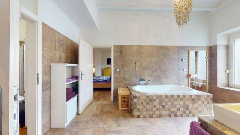 Zur Ausstattung zählen handgehobelter Echtholzparkett, Steinboden, Klimaanlage, Kaminofen, elektrischer Sonnenschutz sowie ein großes Badezimmer mit Fenster, Badewanne, Dusche und Sauna. Der gepflegte Zustand ermöglicht einen raschen Bezug.