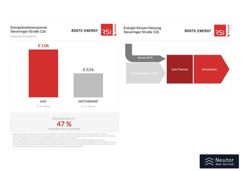 Disclaimer Simulation Energiekostenersparnis: Die Heizkostenberechnung dient der Orientierung und stellt keine verbindliche Kostenzusage dar. Die zugrunde gelegten Preise sind jeweils Gesamtpreise inkl. Netzentgelt, Steuern und Abgaben auf Basis des Marktdurchschnitts für den Verbrauch einer mehrköpfigen Familie in 1190 Wien bei ansässigen Lieferanten ohne Rabatte (09.04.2026). Die ausgewiesenen Heizkosten von 0,56 EUR/m2/Monat beziehen sich auf eine durchschnittliche Wohnung in der Sieveringer Straße 126. Der Berechnung liegen folgende Annahmen zu Grunde: Die Jahresarbeitszahl von 3,53 basiert auf einer dynamischen Stundensimulation mit Klimadaten der Wetterstation Hohe Warte für die Winter 20002024 und stellt einen historischen Mittelwert dar. Die angenommene Vorlauftemperatur von 55 °C basiert auf Messungen aus dem Objekt können aber je nach Betrieb variieren. Die Berechnung erfolgt ohne Berücksichtigung von Hilfsenergie.