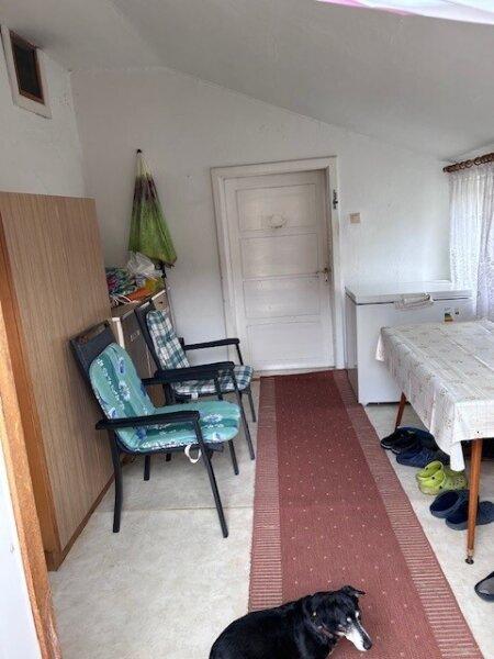 Es teilt sich in 3 Zimmer, Küche, Bad, WC, und Vorraum mit Ausgang in einen großen Abstellraum. An das Haus angebaut ist eine Garage und hinter dem Haus ist nochmal ein geräumiges Gartenhaus für Gartenutensilien.