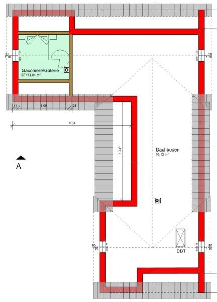 Aktuell wird das Gebäude, wie Sie auf den Plänen im Erdgeschoß und Dachgeschoß sehen, für 2 Wohneinheiten mit 2 Eingängen genutzt.