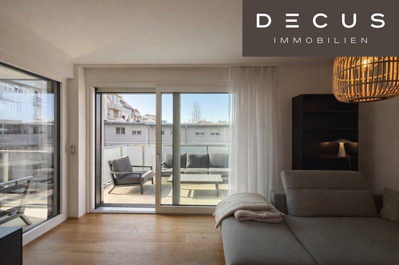 Der repräsentative Wohnbereich öffnet sich direkt zur großzügigen Terrasse und erweitert den Lebensraum ins Freie ideal für entspannte Stunden, stilvolle Abende oder ein Frühstück in der Sonne. Eine zweite, vom Schlafzimmer aus zugängliche Terrasse bietet zusätzlichen privaten Rückzugsraum und unterstreicht den besonderen Wohnkomfort dieser Immobilie.