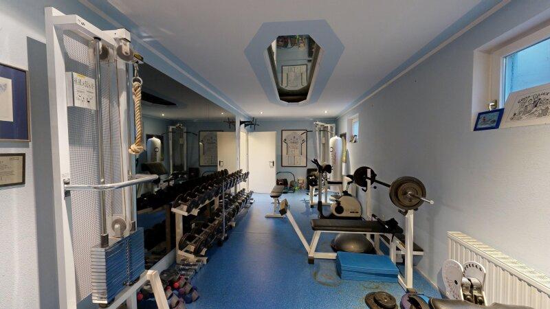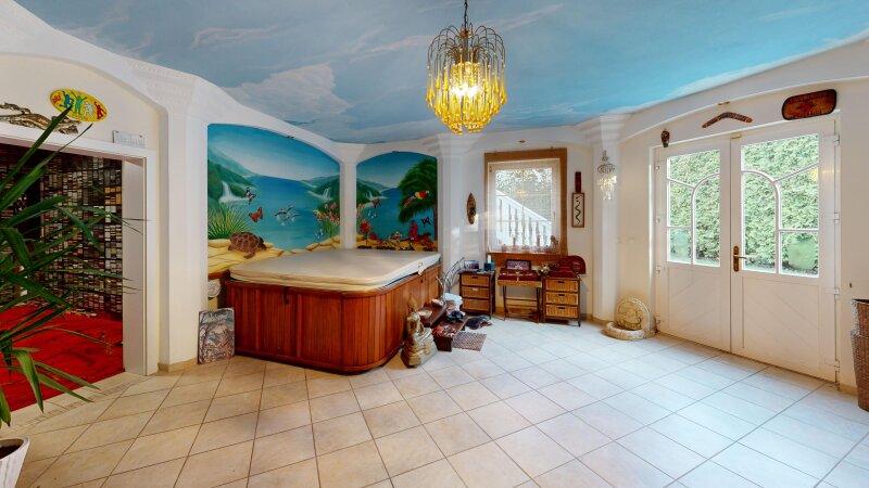 Der Wohnkeller eröffnet zahlreiche Optionen und eignet sich unter anderem als separate Wohneinheit, Büro oder großzügiger Freizeit- und Wellnessbereich. Hier befinden sich unter anderem ein privates Kino- und Musikzimmer, ein Fitnessraum sowie mehrere Nebenräume. Ergänzt wird dieser Bereich durch eine Wellnesszone mit Whirlpool, Sauna, Solarium, Dusche und Ruhezonen.