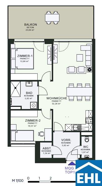 Das MQG wird als siebengeschossige bis zehngeschossige Hofstruktur realisiert und überzeugt durch eine hochwertige architektonische Umsetzung. Die vier Baukörper sind jeweils zweihüftig organisiert und über großzügige, bis zu acht Meter breite Längsatri­en erschlossen, die als kommunikative Begegnungszonen dienen. Dank transparenter Glasüberdachungen sind diese Bereiche wettergeschützt und gleichzeitig lichtdurchflutet, wodurch eine angenehme Atmosphäre entsteht. Zudem ermöglicht dieses Konzept eine optimale Querlüftung aller Wohnungen.