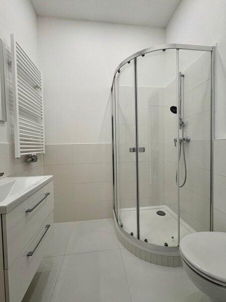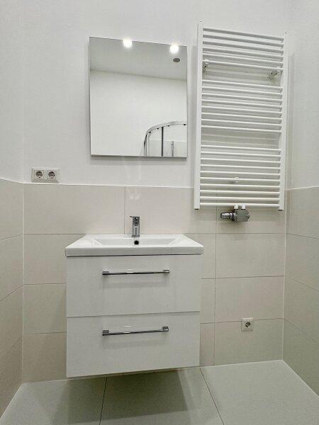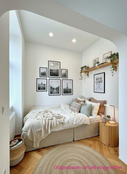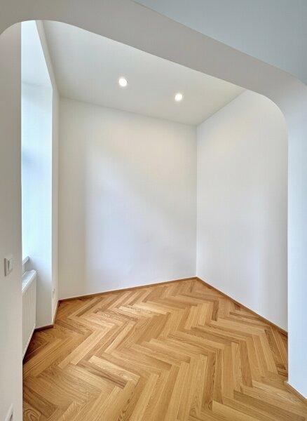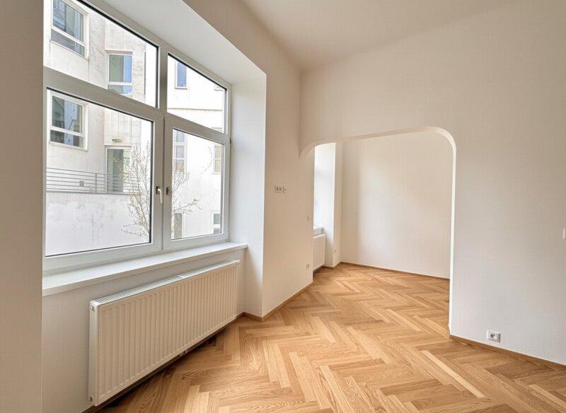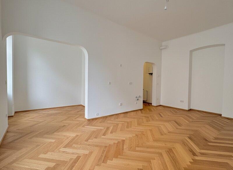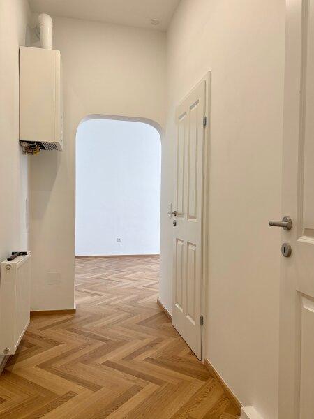 Mit knapp 38m² ist sie nicht die größte, aber so charmant, dass das zur Nebensache wird, sobald man sie betritt. Ein erstes kleines Vorzimmer - Windfang genannt - bietet sich als Garderobe an. Der folgende Vorraum lässt sich gut als Stauraum nutzen. Von hier kommt man auch gleich ins komfortable Badezimmer in elegant hellen Farbtönen mit Dusche, WC und Waschmaschinenanschluss. Gerade aus geht es weiter in die großzügige, helle Wohnküche, die Anschlüsse sind bereits vorbereitet. Besonders hübsch ist der runde Bogen im Durchgang, welcher als Element noch einmal bei der kuscheligen Schlafnische aufgegriffen wird. Die großen Kunststofffenster gehen in einen Innenhof, der teilweise begrünt ist und sehr ruhig ist. In der Nische könnte man ein Hochbett unterbringen, der Raum ist hoch genug und es sind bereits Spots in der Decke eingelassen. Bei der Sanierung wurde höchstes Augenmerk auf die Erhaltung des originalen Altbaucharakters gelegt, ein neuer Fischgrät-Parkett verlegt und passende Innentüren verbaut. Elektrik, Heizung und Sanitärinstallationen wurden vollständig erneuert