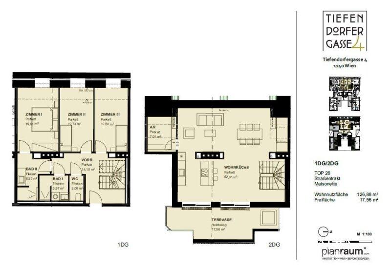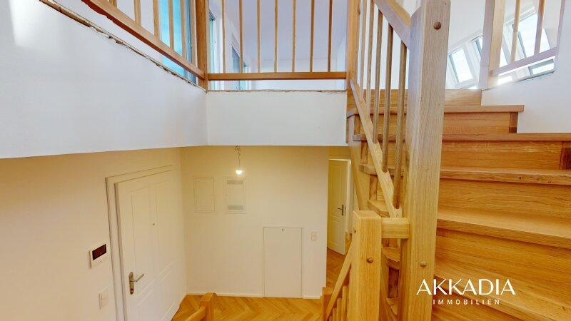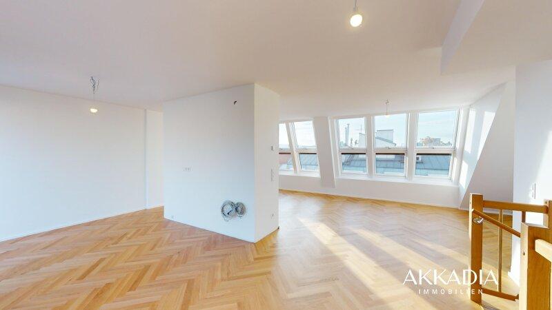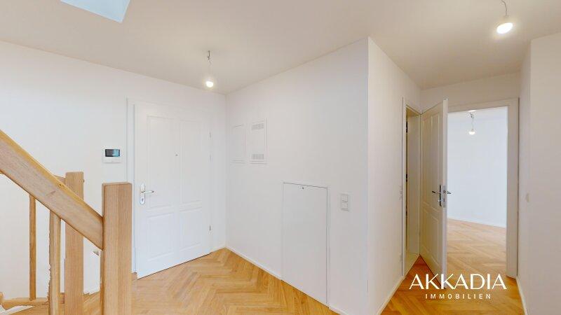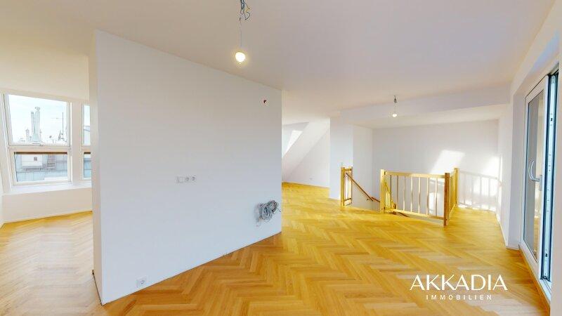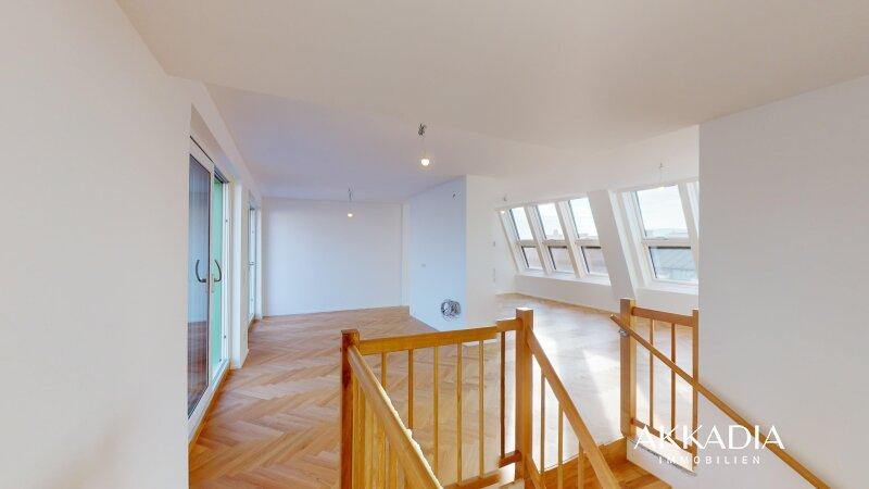 Die gegenständliche Maisonette befindet sich im Dachgeschoß und verfügt über eine Wohnfläche von ca. 127 m². Auf der unteren Ebene stehen Ihnen ein Vorzimmer, ein Masterbedroom, zwei weitere Schlafzimmer und ein Badezimmer mit  zur Verfügung. Über eine Treppe gelangen Sie auf die oberen Ebene, wo sich eine großzügige Wohnküche mit Ausgang auf die ruhige Dachterrasse und ein Abstellraum befinden.