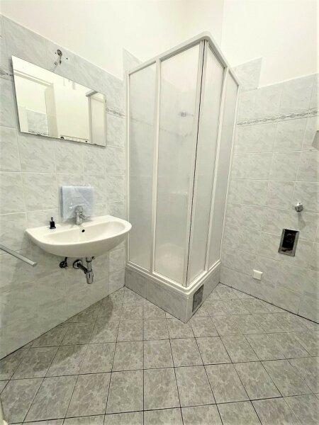 + Badezimmer mit Dusche, Waschtisch und Waschmaschinenanschluss
