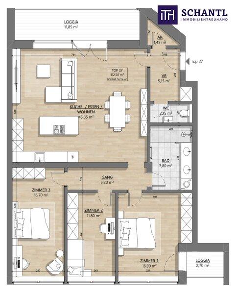 Top 27:  112m² Nord-Südseitige ausgerichtete 4-Zimmer-Wohnung mit 2 feinen Loggien!